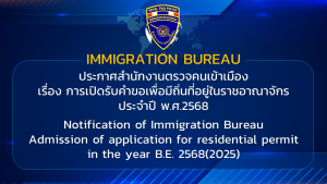 📣 ประกาศสํานักงานตรวจคนเข้าเมือง เรื่อง การเปิดรับคําขอเพื่อมีถิ่นที่อยู่ในราชอาณาจักร พ.ศ.2568 📢 Announcement: Applications Open for Permanent Residency in the Kingdom of Thailand – B.E. 2568 9 มีนาคม 2026