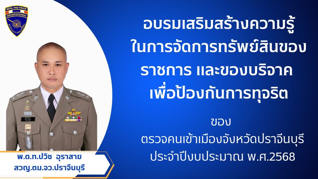 เพื่อป้องกันการทุจริต ของ ตม.จว.ปราจีนบุรี ประจำปีงบประมาณ พ.ศ.2568 ขึ้น เพื่อเพิ่มความรู้ความเข้าใจให้ข้าราชการตำรวจในสังกัด ตม.จว.ปราจีนบุรี ในการรับรู้รับทราบแนวทางปฏิบัติเกี่ยวกับการจัดการทรัพย์สินของราชการ การเก็บ การบันทึก การเบิกจ่าย การยืม การตรวจสอบ การบำรุงรักษา ตลอดจนการจำหน่าย ทรัพย์สินของทางราชการ และรับทราบขั้นตอน และระเบียบเกี่ยวกับการรับของบริจาค จนสามารถนำไปสู่การปฏิบัติได้อย่างถูกต้องตามระเบียบ กฏหมาย ป้องกันปัญหาการทุจริตในหน่วยงาน ตม.จว.ปราจีนบุรี