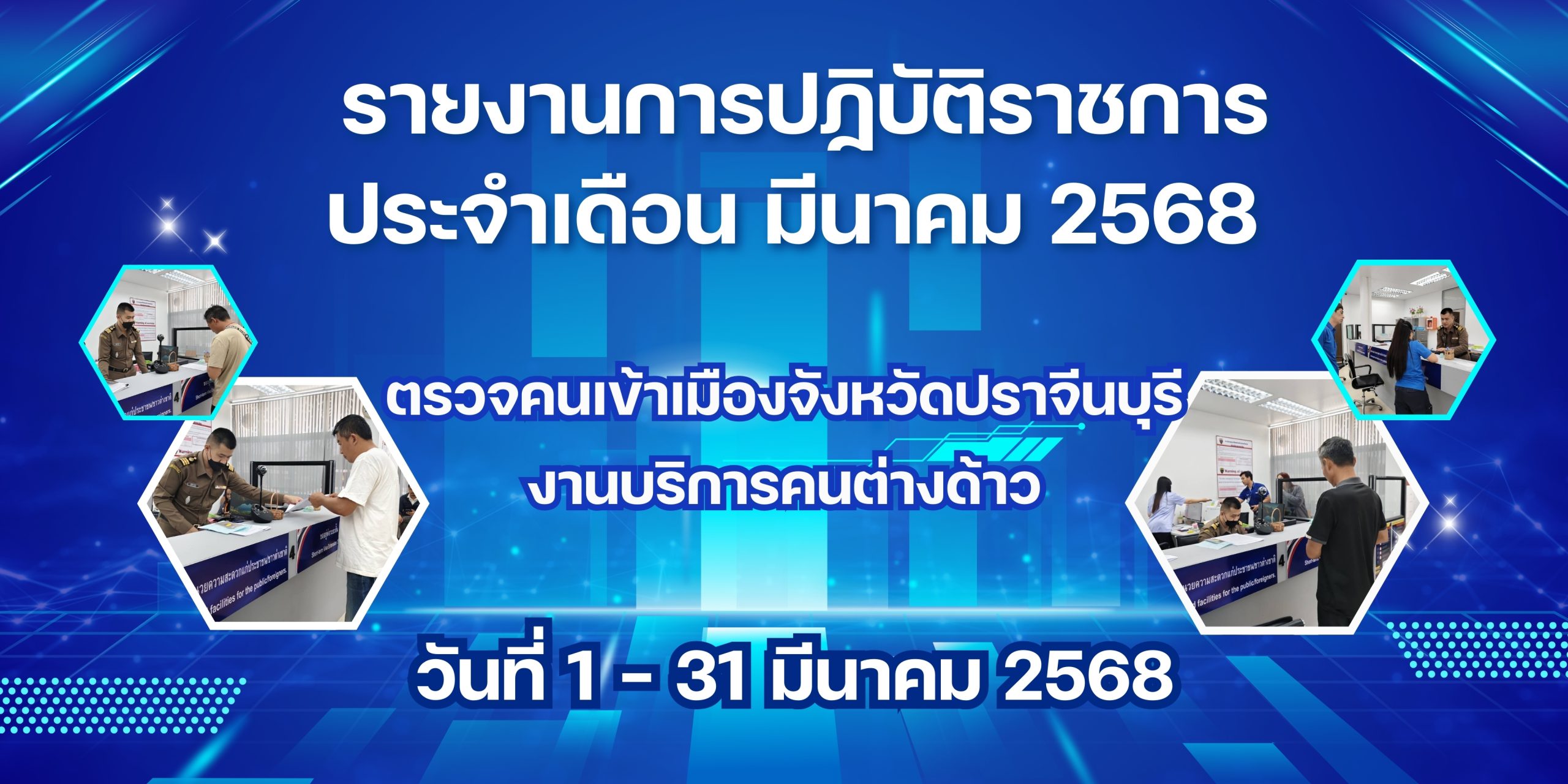 31 มีนาคม 20252 เมษายน 2025งานบริการคนต่างด้าว, งานบริการคนต่างด้าว ประจำเดือน มีนาคม 2568 รายงานการปฏิบัติราชการประจำเดือน มีนาคม 2568 ประจำปีงบประมาณ พ.ศ.2568 ตรวจคนเข้าเมืองจังหวัดปราจีนบุรี งานบริการคนต่างด้าว วันที่ 1-31 มีนาคม 2568