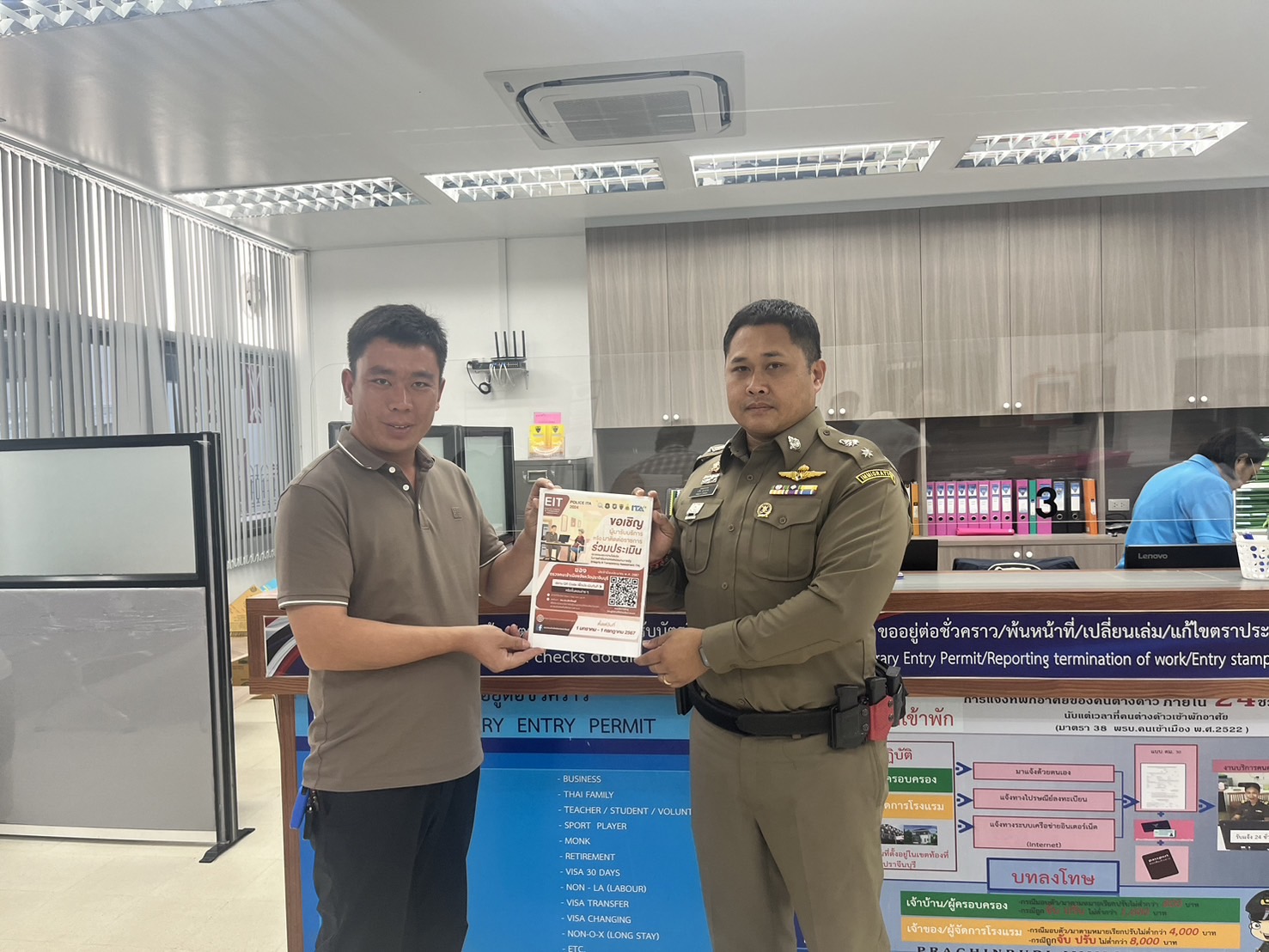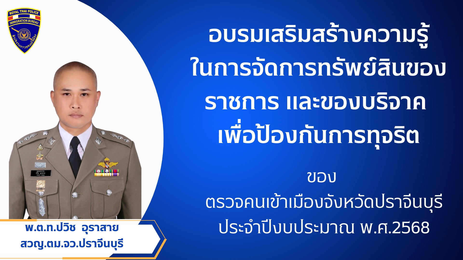 10 มกราคม 202521 มีนาคม 2025การมีส่วนร่วมของหัวหน้าตรวจคนเข้าเมืองจังหวัด 2568 วันที่ 10 มกราคม 2568 เวลา 12.00 น. พ.ต.ท.ปวิช อุราสาย นำข้าราชการตำรวจในสังกัด ตม.จว.ปราจีนบุรี ติดป้ายประกาศนโยบายการต่อต้านการรับสินบน ของ ตม.จว.ปราจีนบุรี ประจำปีงบประมาณ พ.ศ.2568