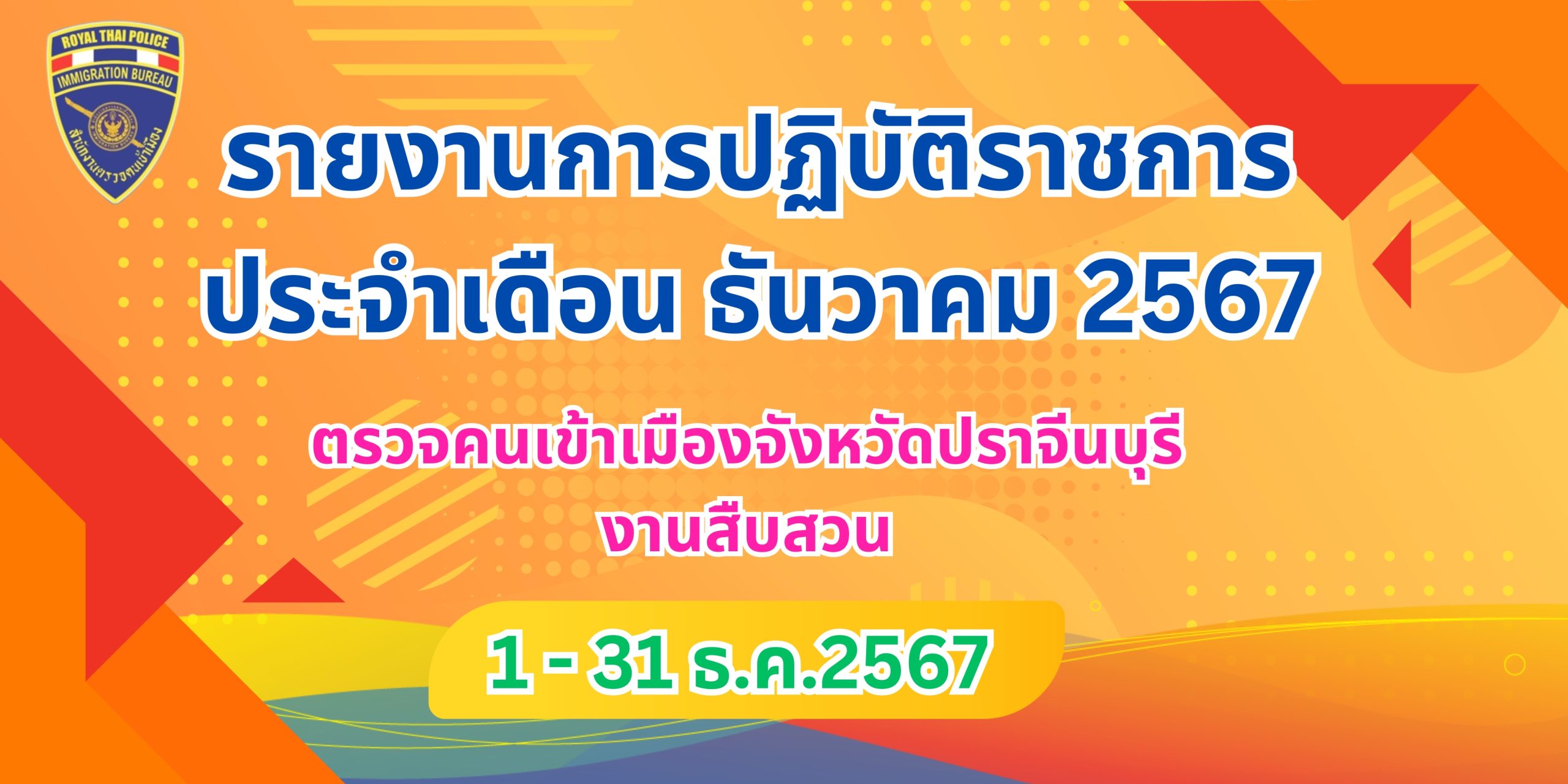 31 ธันวาคม 20244 เมษายน 2025งานสืบสวน, งานสืบสวน ประจำเดือน ธันวาคม 2567 รายงานการปฏิบัติราชการประจำเดือน ธันวาคม 2567 ประจำปีงบประมาณ พ.ศ.2568 ตรวจคนเข้าเมืองจังหวัดปราจีนบุรี งานสืบสวน วันที่ 1-31 ธ.ค. 2567