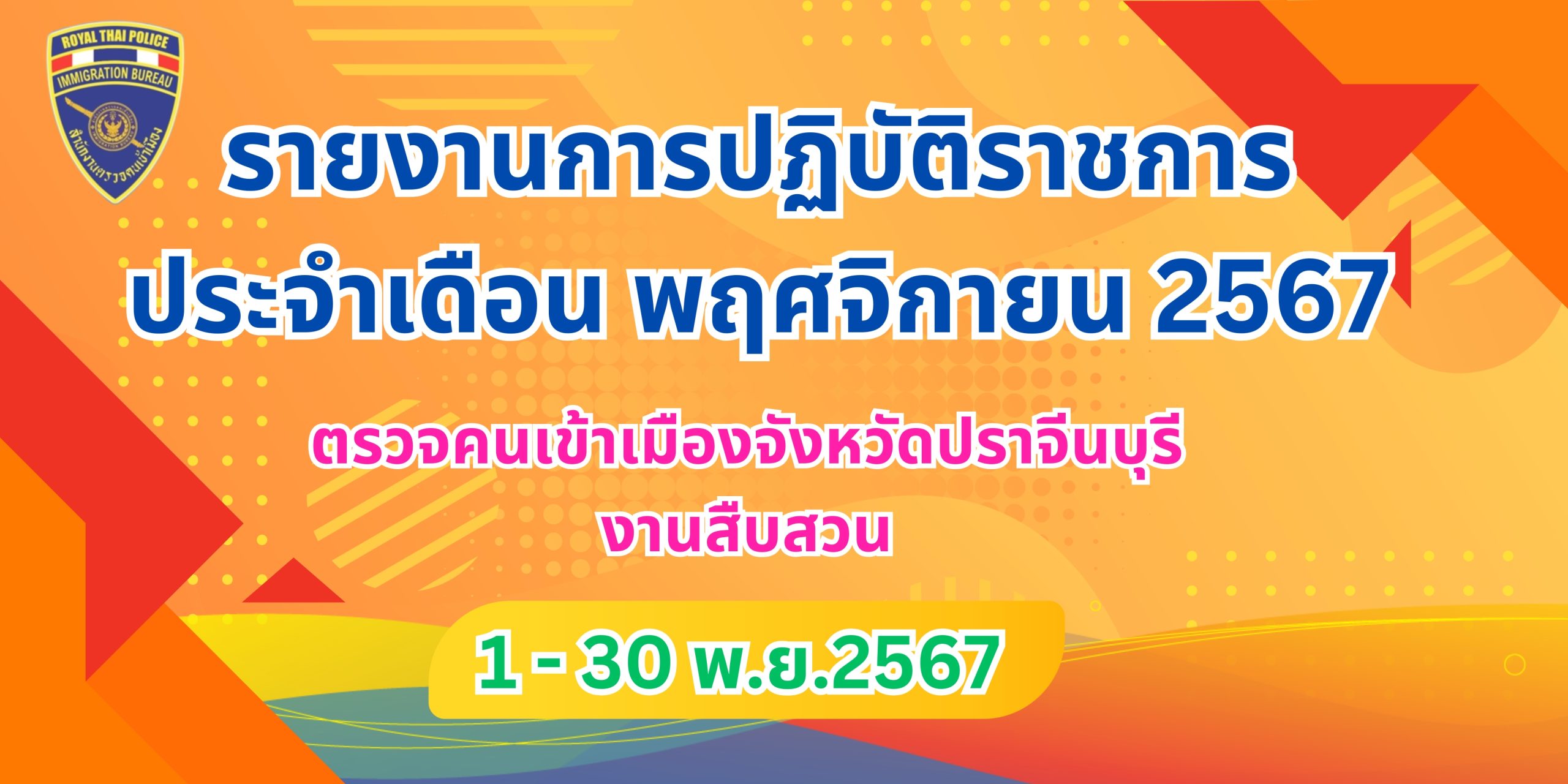 30 พฤศจิกายน 20241 เมษายน 2025งานสืบสวน, งานสืบสวน ประจำเดือน พฤศจิกายน 2567 รายงานการปฏิบัติราชการประจำเดือน พฤศจิกายน 2567 ประจำปีงบประมาณ พ.ศ.2568 ตรวจคนเข้าเมืองจังหวัดปราจีนบุรี งานสืบสวน วันที่ 1-30 พ.ย. 2567