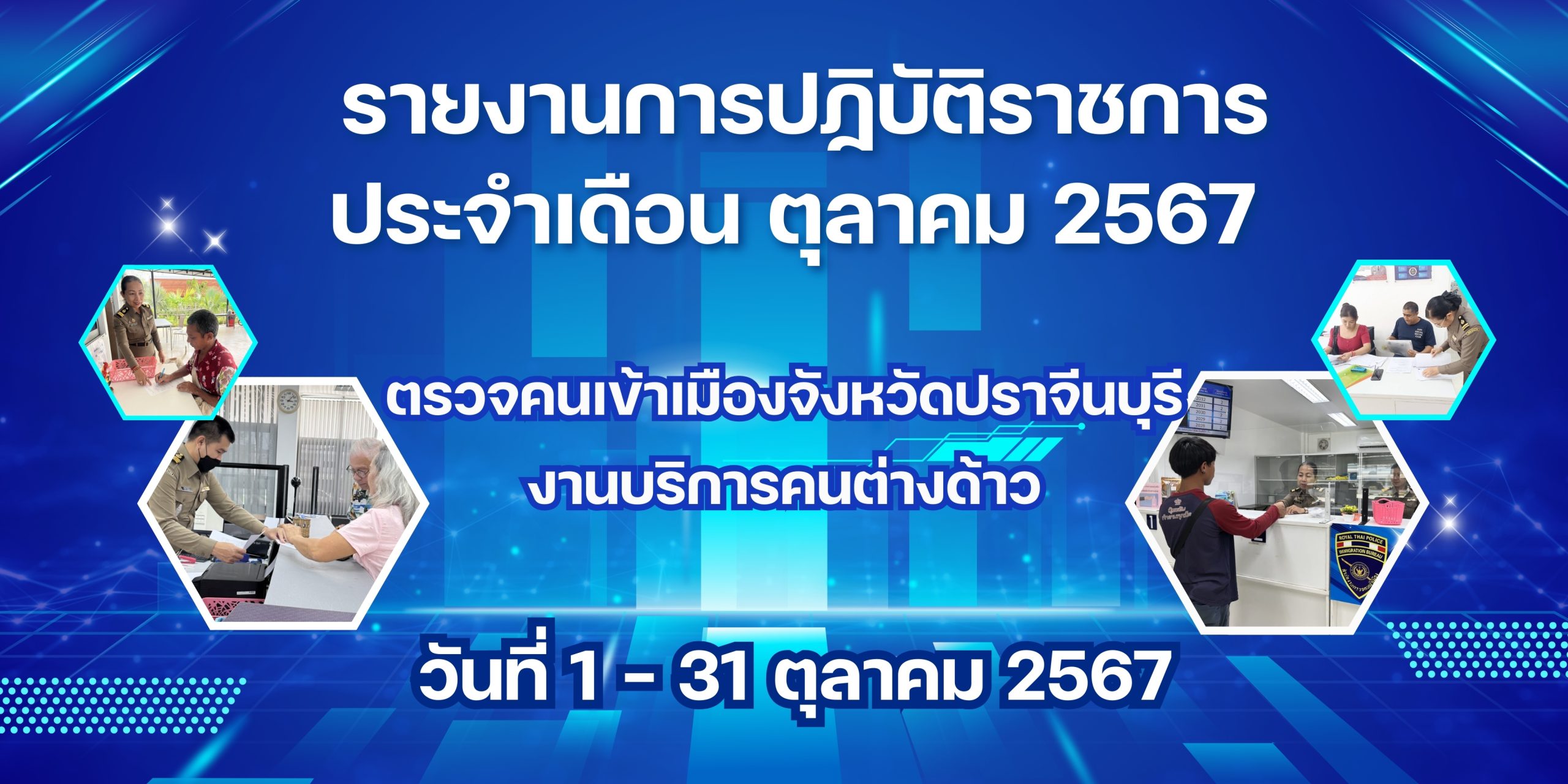 31 ตุลาคม 20241 เมษายน 2025งานบริการคนต่างด้าว, งานบริการคนต่างด้าว ประจำเดือน ตุลาคม 2567 รายงานการปฏิบัติราชการประจำเดือน ตุลาคม 2567 ประจำปีงบประมาณ พ.ศ.2568 ตรวจคนเข้าเมืองจังหวัดปราจีนบุรี งานบริการคนต่างด้าว วันที่ 1-31 ตุลาคม 2567